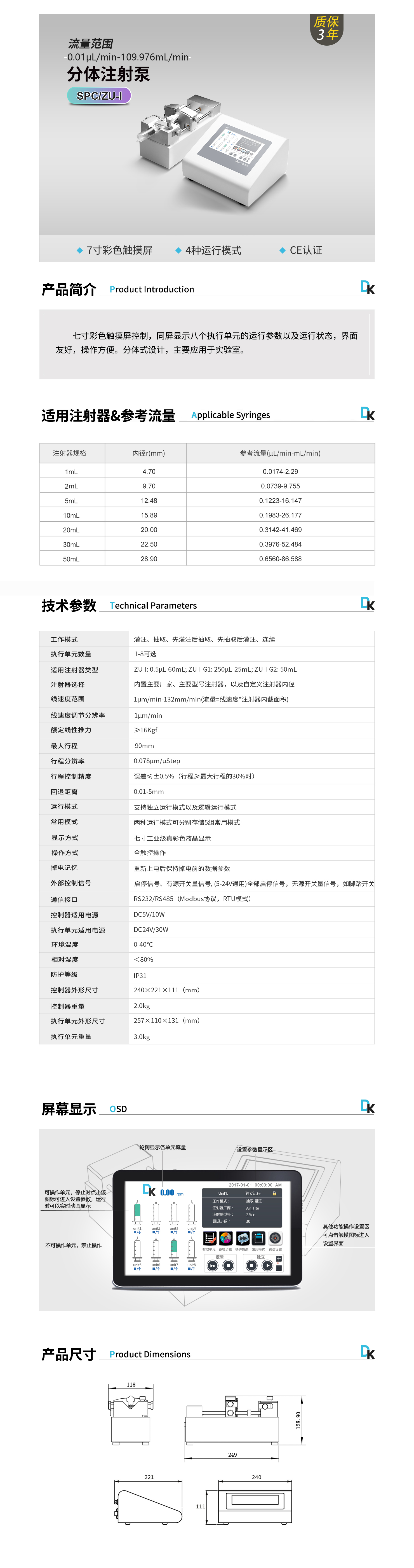 線速度范圍:1μm/min-132mm/min(流量=線速度*注射器內(nèi)截面積)